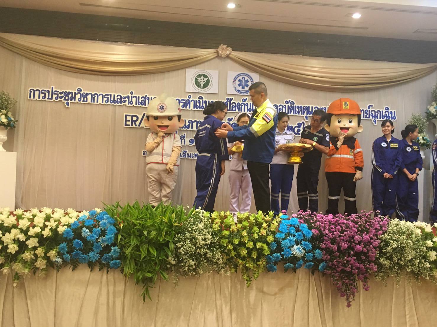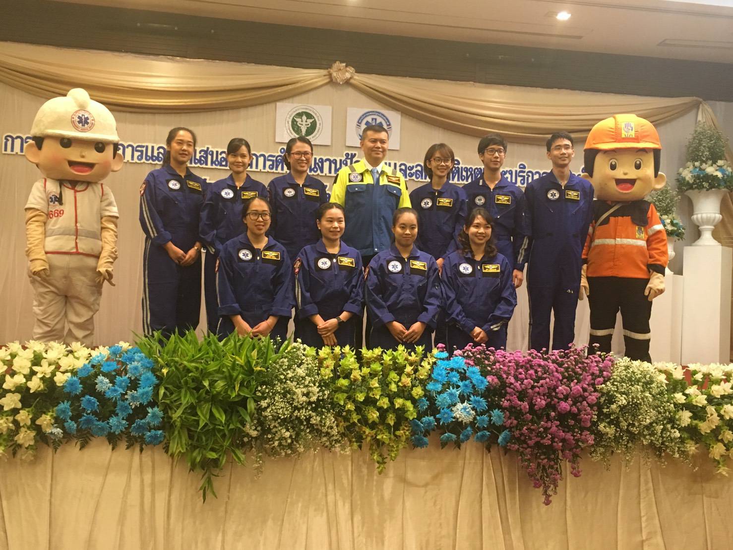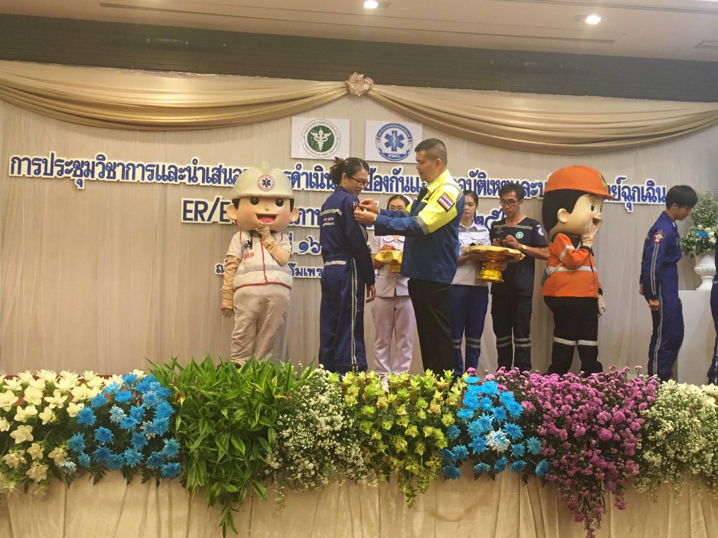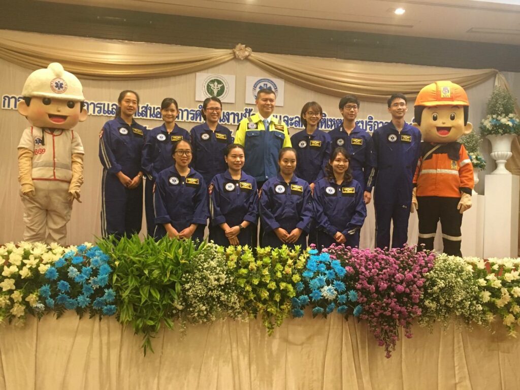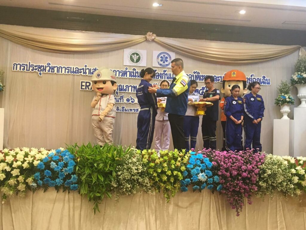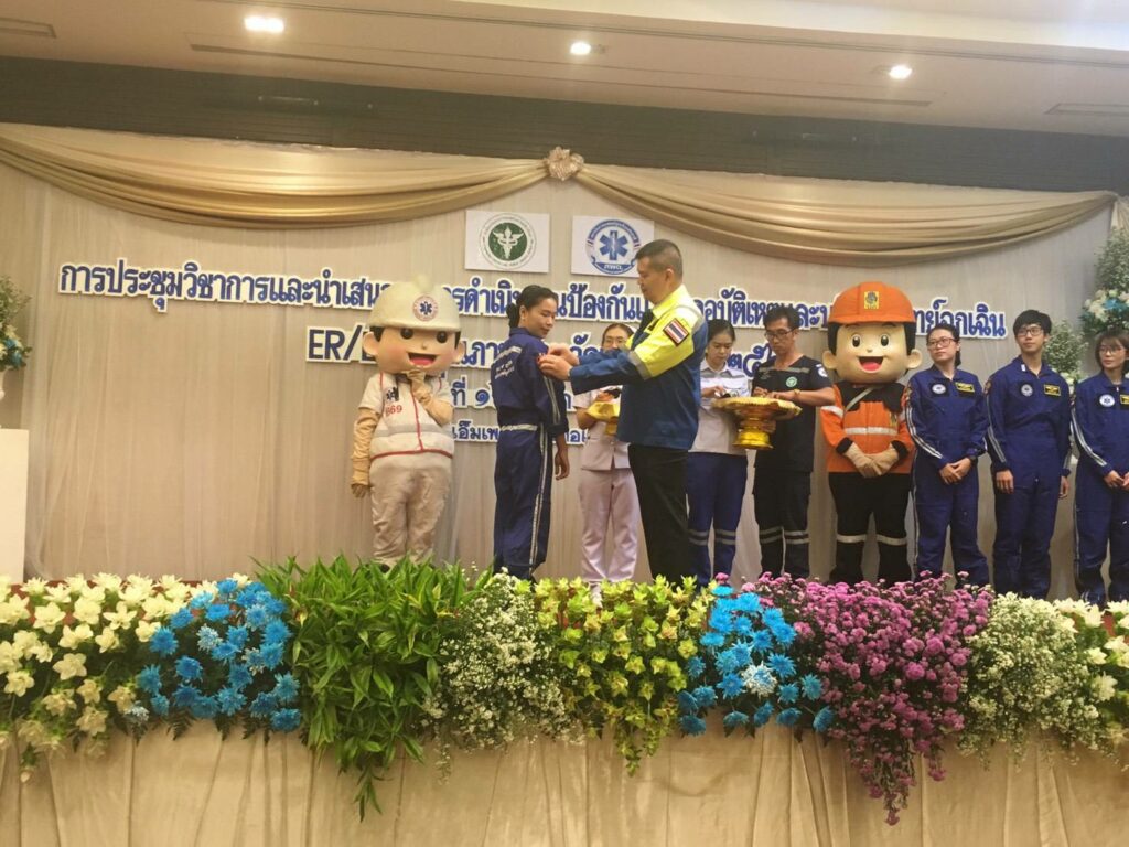 พยาบาลหน่วยตรวจฉุกเฉิน และหน่วยบริการการแพทย์ฉุกเฉิน เนื่องในโอกาสที่ผ่านการอบรมหลักสูตรการลำเลียงผู้ป่วยทางอากาศ Aeromedical Evacuation Course (Thai Sky Doctor Service) และได้รับการประดับตราสัญลักษณ์ปีก Sky Doctor จาก ร.อ.นพ.อัจฉริยะ แพงมา เลขาธิการสถาบันการแพทย์ฉุกเฉินแห่งชาติ ในงานประชุมวิชาการและนำเสนอผลการดำเนินงานป้องกันและลดอุบัติเหตุ และการบริการการแพทย์ฉุกเฉิน ER/ECS คุณภาพ เมื่อวันที่ 16 สิงหาคม 2562 ณ โรงแรม The Empress Chiang Mai