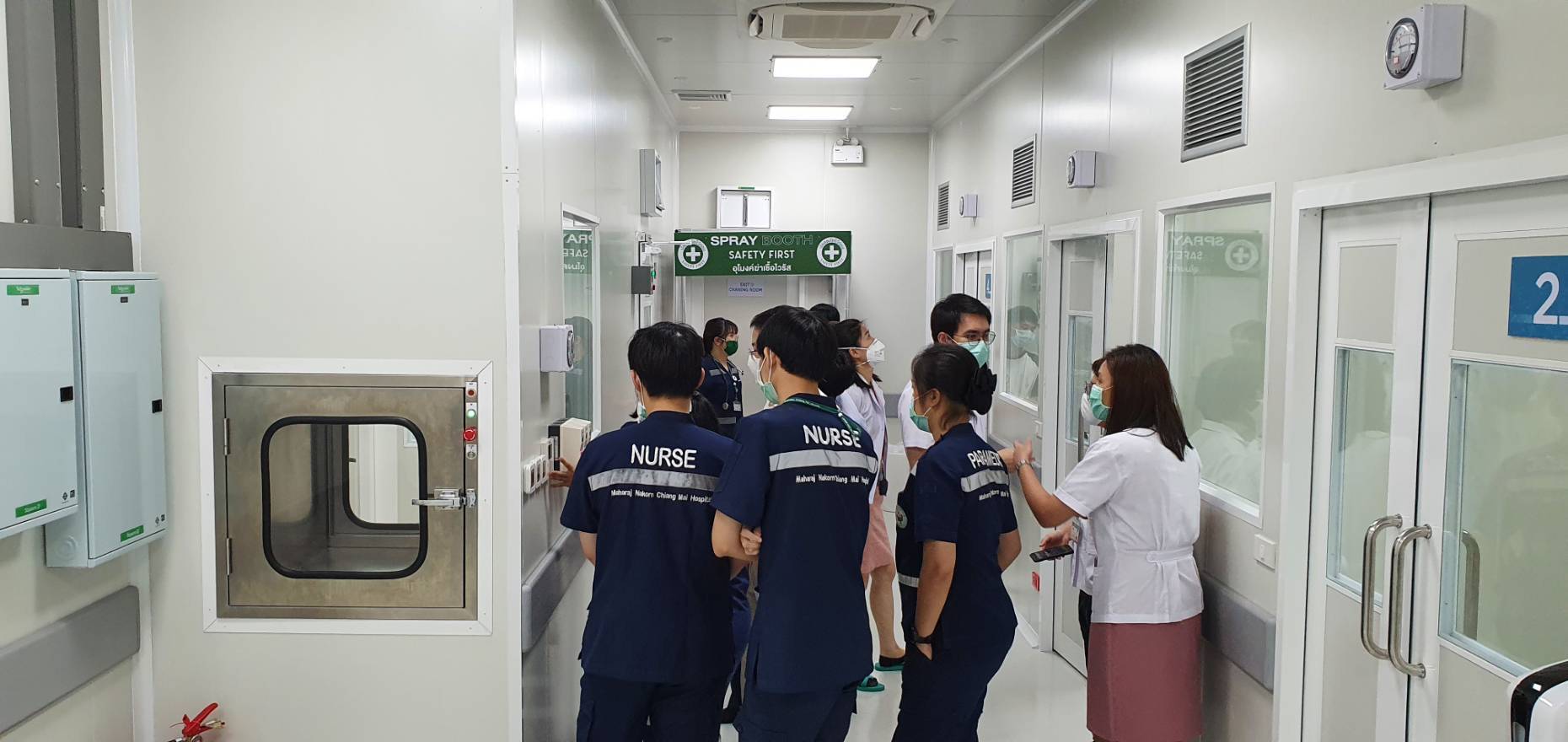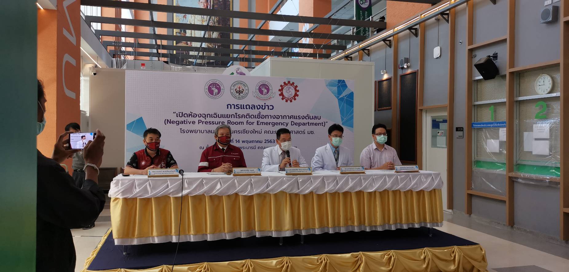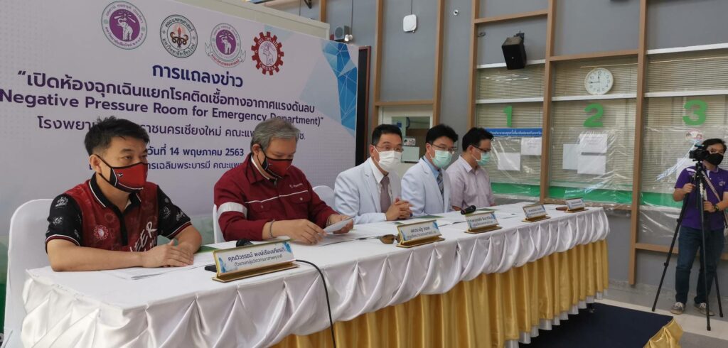 ศ.นพ.บรรณกิจ โลจนาภิวัฒน์ คณบดีคณะแพทยศาสตร์ มช. เป็นประธานในการแถลงข่าว พิธีเปิดห้องฉุกเฉินแยกโรคติดเชื้อทางอากาศแรงดันลบ ( Negative Pressure Room for Emergency Department ) โรงพยาบาลมหาราชนครเชียงใหม่ โดยมี ผศ.ดร.ณัฐ วรยศ คณบดีคณะวิศวกรรมศาสตร์ มช. รศ.นพ.ชัยวัฒน์ บำรุงกิจ ผู้อำนวยการโรงพยาบาลมหาราชนครเชียงใหม่ คุณวิวรรธน์ พงษ์เรืองเกียรติ คุณธนวัช โพคะรัตน์ศิริ ตัวแทนกลุ่มวิศวกรอาสาพหุภาคี และ ผศ.นพ. นเรนทร์ โชติรสนิรมิต ผู้อำนวยการศูนย์ความเป็นเลิศทางการแพทย์ และหัวหน้าฝ่ายปฏิบัติการต้านโควิด-19 โรงพยาบาลมหาราชนครเชียงใหม่ โดยห้องนี้เป็นความร่วมมือระหว่างคณะแพทยศาสตร์ มช. คณะวิศวกรรมศาสตร์ มช. และสมาคมศิษย์เก่าคณะวิศวกรรมศาสตร์ มช. ที่ได้นำองค์ความรู้ที่ถูกต้อง ได้มาตรฐานระดับสากล ใช้เวลาก่อสร้างเพียง 21 วัน ซึ่งนับได้ว่ารวดเร็วที่สุดเท่าที่เคยมีมา โดยเป็นห้องกักกันเชื้อที่มีระบบระบายอากาศแยกจากส่วนอื่นๆ สามารถบำบัดอากาศและฆ่าเชื้อโรคด้วย HEPA Filter + UVC และ Ozone ก่อนปล่อยออกสู่สาธารณะ โดยภายในประกอบไปด้วย ห้องรักษาจำนวน 4 ห้อง และแต่ละห้องจะมีความดันเป็นลบ ทำให้อากาศจากภายในห้องไม่ไหลย้อนออกมาสู่ภายนอก เพิ่มความปลอดภัยให้กับบุคลาการทางการแพทย์และผู้ที่มาใช้บริการ โดยห้องนี้ไม่ได้มีไว้แค่ป้องกันการแพร่กระจายของเชื้อ COVID-19 แต่สามารถป้องกันโรคทางเดินหายใจอื่นๆอีกด้วย อาทิ โรควัณโรค โรคไข้หวัดใหญ่ ซึ่งโรคเหล่านี้ยังมีการติดต่ออยู่ในปัจจุบัน ทั้งนี้น่าจะเป็น new normal ของห้องฉุกเฉินในอนาคต เพราะยังคงมีโรคที่อาจจะอุบัติใหม่ โรคติดต่อทางเดินหายใจเดิมที่ยังคงรบกวนสุขภาพของประชาชนทั่วไป ทำให้เราต้องมีสิ่งใหม่ๆเพื่อป้องกันการระบาดเกิดขึ้นในห้องฉุกเฉิน บุคลากรทางการแพทย์ ผู้ป่วยและญาติก็มีความปลอดภัยอีกด้วย ห้องนี้ใช้งบประมาณในการก่อสร้างกว่า 5.5 ล้านบาท ผ่านมูลนิธิโรงพยาบาลสวนดอก และบริจาคเพิ่มเติมจากสมาคมศิษย์เก่าคณะวิศวกรรมศาสตร์ มช. เมื่อวันที่ 14 พฤษภาคม 2563 ณ โถงชั้น 1 อาคารเฉลิมพระบารมี คณะแพทยศาสตร์ มช.