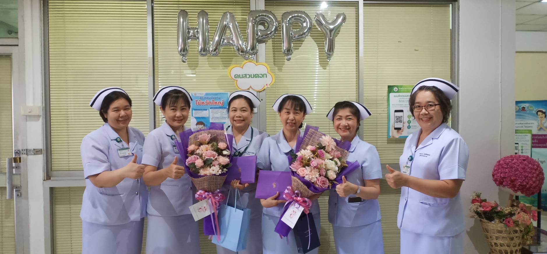 The head of Outpatient and Emergency Nursing section along with nurse supervisors gave flower bouquets to congratulate 2 head nurses; Miss Jiraporn Rungrueang, the head nurse of Pediatric OPD and Miss Wongduean Chaiwipasatorn, the head nurse of Obstetric OPD who both completed the Specialised Nursing Program in Nursing Administration from Nursing Service Center, Faculty of Nursing, Chiang Mai University.
