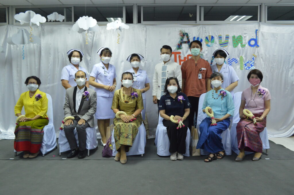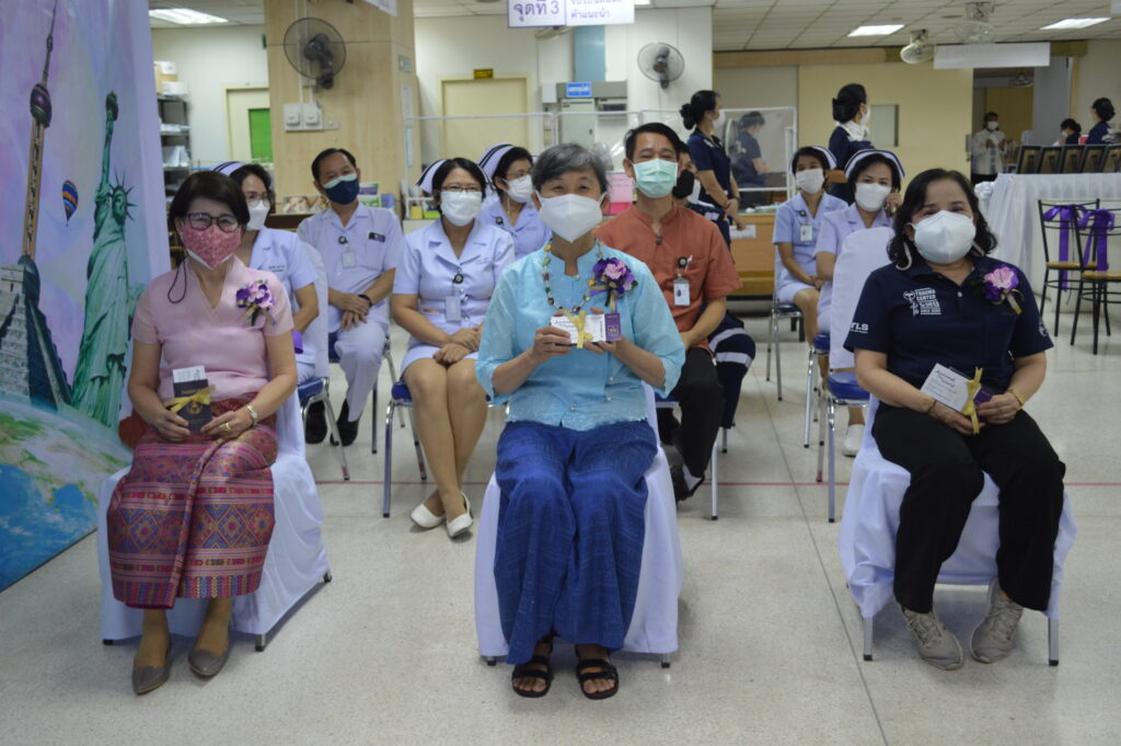 คุณกมรวรรณ หงส์ลดารมภ์ หัวหน้างานการพยาบาลผู้ป่วยนอกและผู้ป่วยฉุกเฉิน พร้อมด้วยคณะผู้ตรวจการ ตัวแทนเจ้าหน้าที่ร่วมจัดงานแสดงมุฑิตาจิตแด่