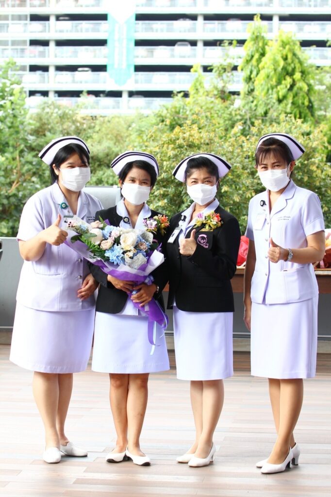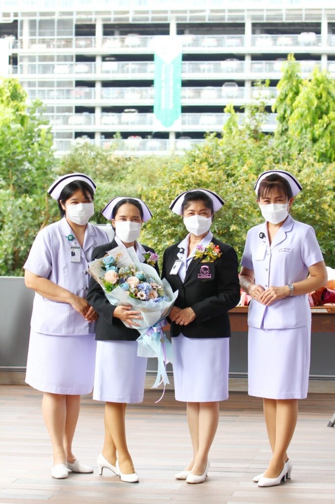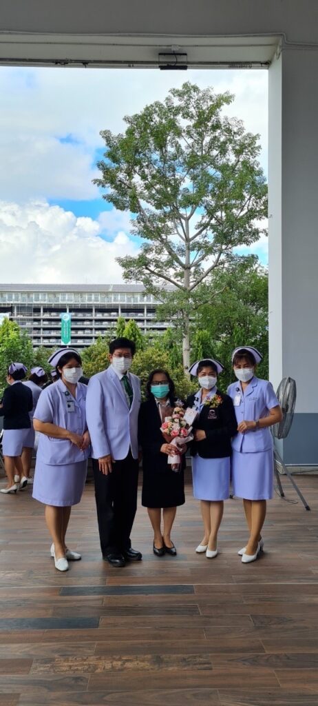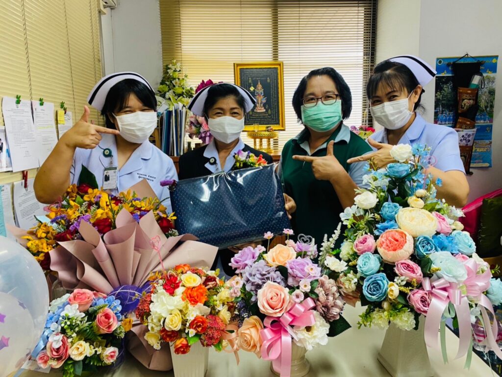 คณะผู้ตรวจการงานการพยาบาลผู้ป่วยนอกและผู้ป่วยฉุกเฉิน พร้อมด้วยกลุ่มตัวแทนของงานฯ มอบช่อดอกไม้แสดงความยินดีกับ