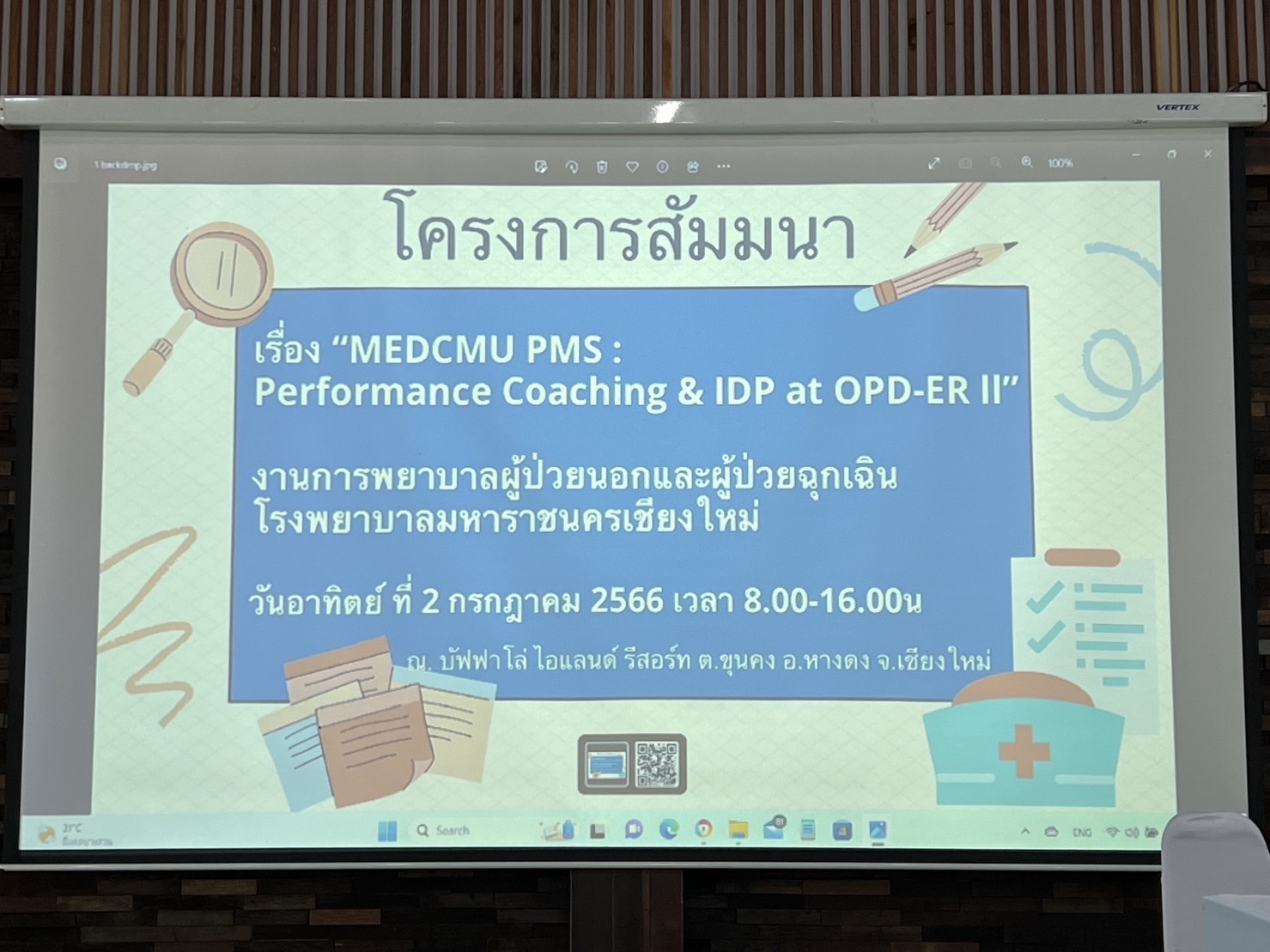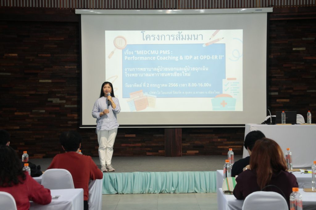 คุณกมรวรรณ หงส์ลดารมภ์ หัวหน้างานการพยาบาลผู้ป่วยนอกและผู้ป่วยฉุกเฉิน ให้เกียรติเป็นประธานเปิดการอบรมและวิทยากร ในการอบรม ” MEDCMU PMS: Performance Coaching & IDP at OPD-ER II ” พร้อมด้วยทีมบริหารงานการพยาบาลผู้ป่วยนอกและผู้ป่วยฉุกเฉิน