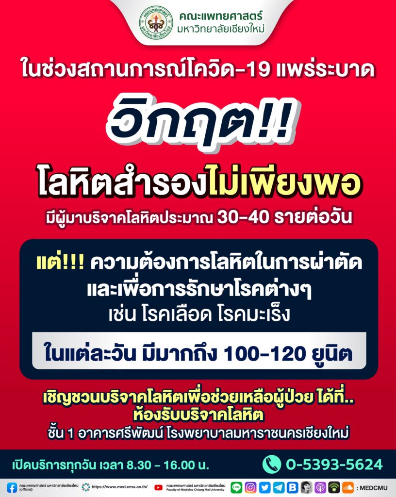 รพ.มหาราช ขาดแคลนโลหิต ขอเชิญร่วมบริจาคโลหิตเพื่อช่วยชีวิตผู้ป่วย