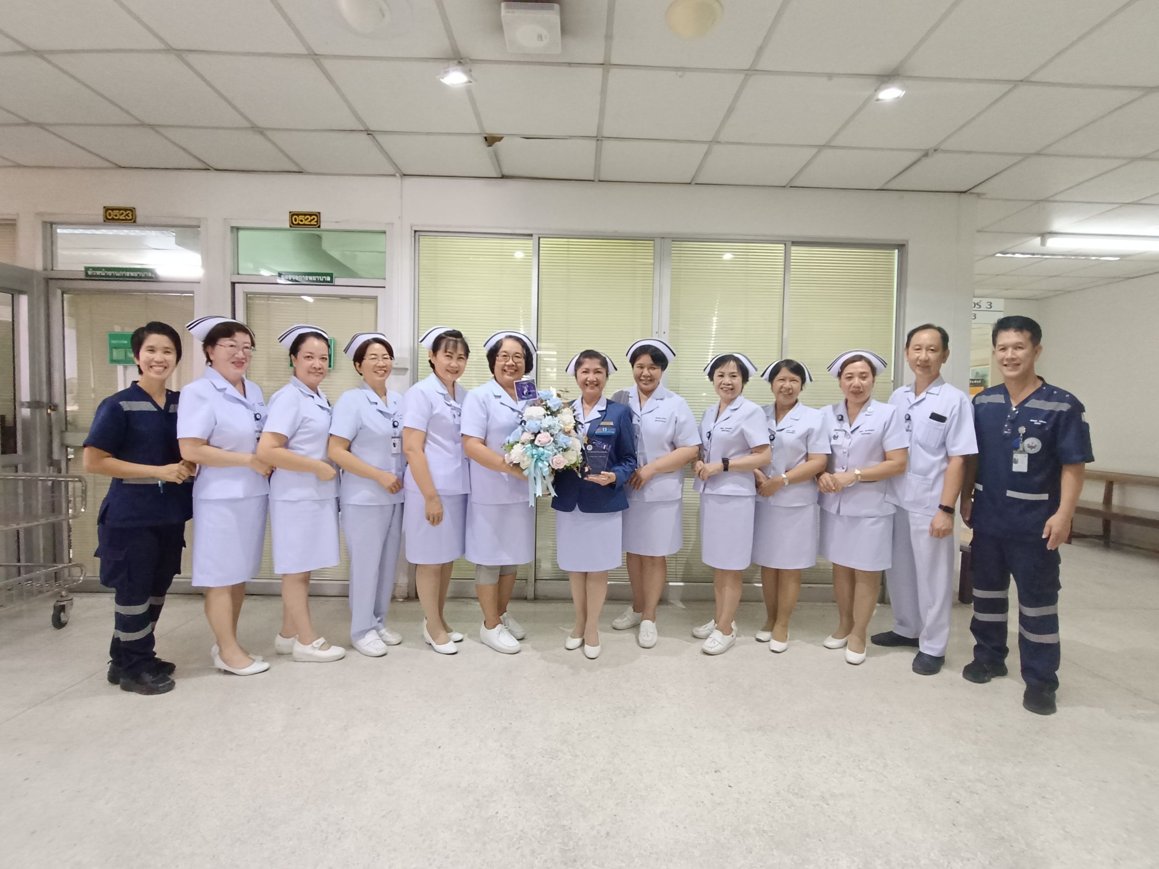 งานการพยาบาลผู้ป่วยนอกและผู้ป่วยฉุกเฉิน นำโดยคณะผู้ตรวจการ และหัวหน้าหน่วย มอบช่อดอกไม้แสดงความยินดีกับ