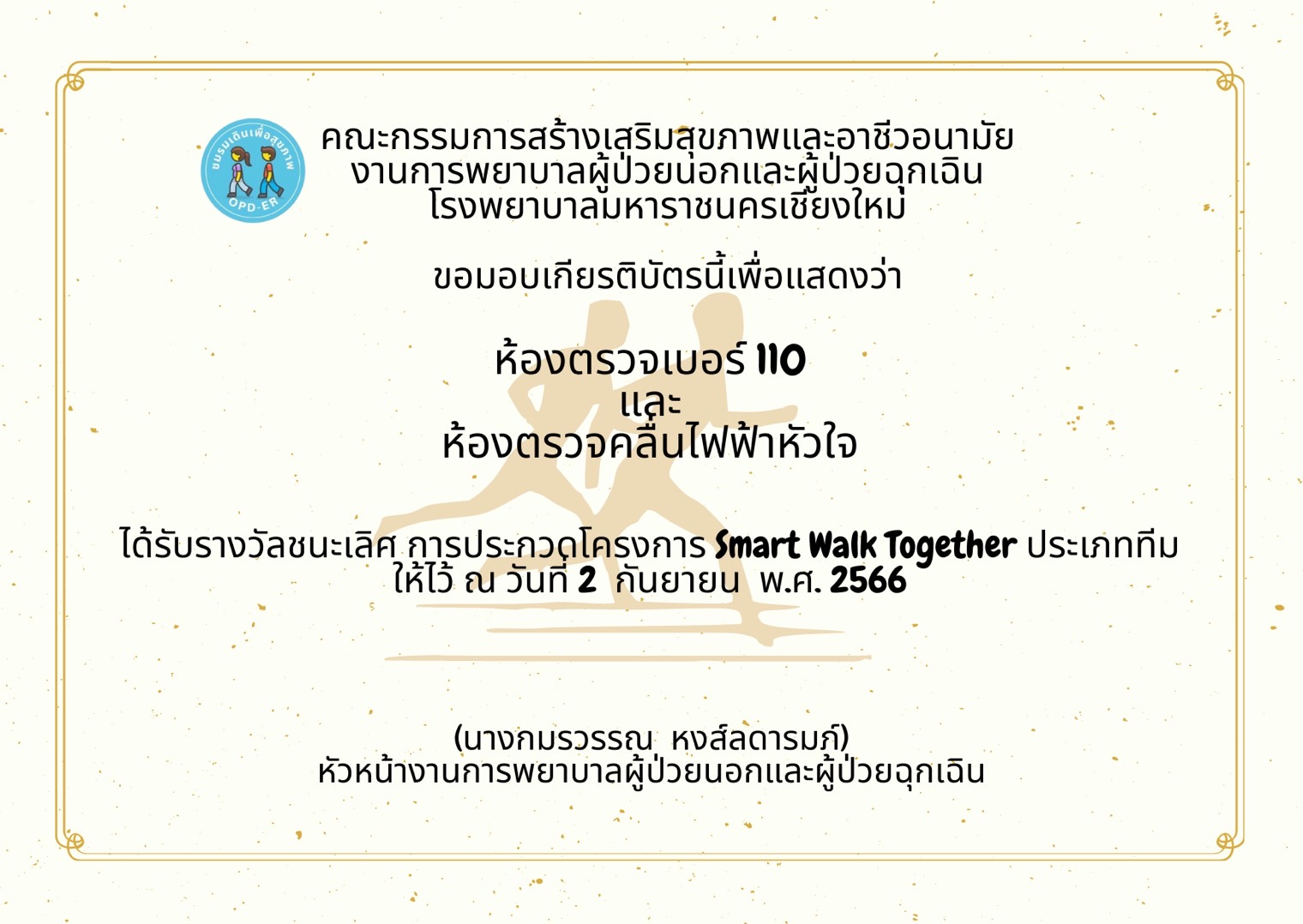 - ห้องตรวจเบอร์110และห้องตรวจคลื่นไฟฟ้าหัวใจ ได้รับรางวัลชนะเลิศประเภททีม
